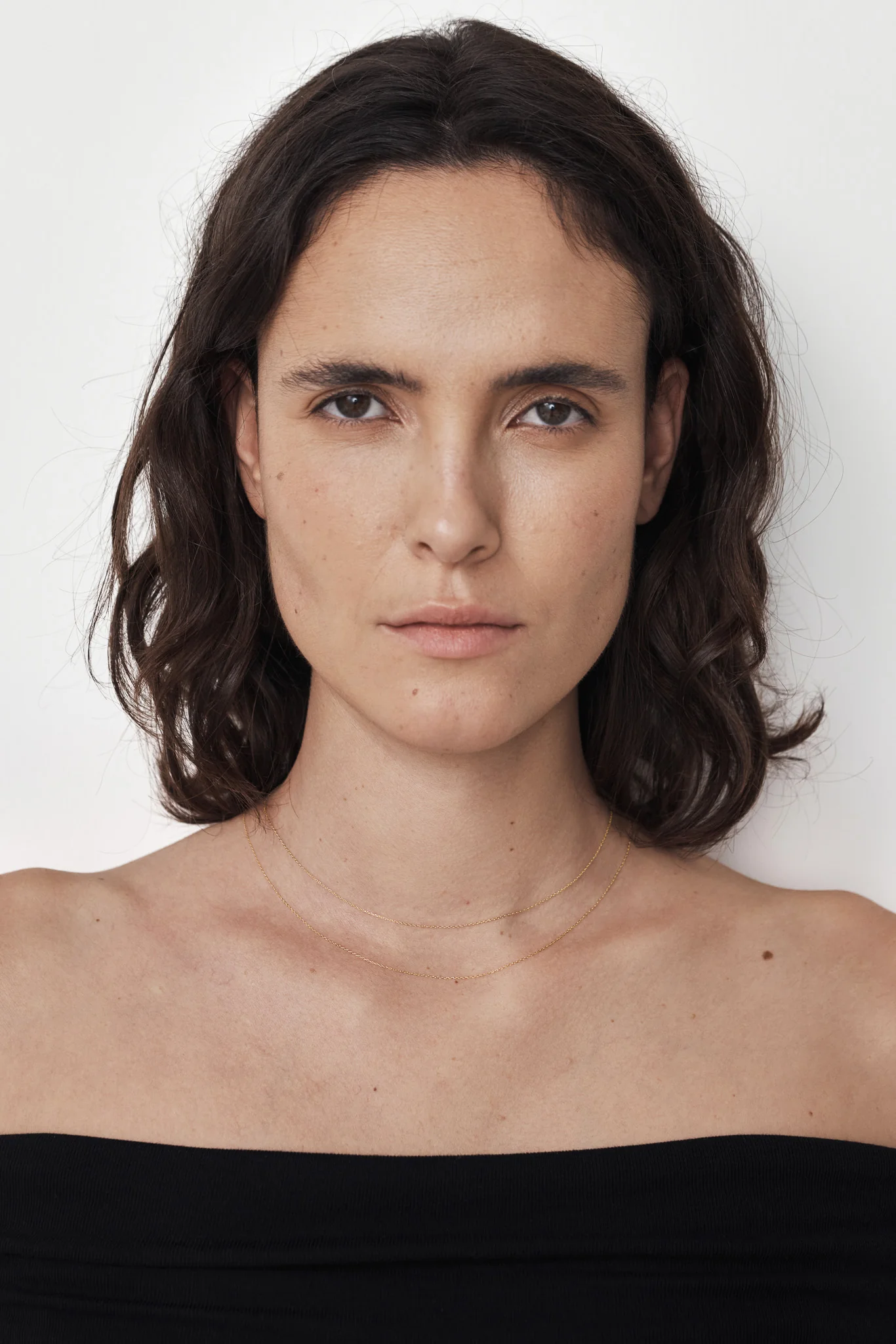 繊細な光を纏うようにチェーンが美しく重なるレイヤードネックレス。肌にやわらかく沿うように設計され、最初から完成された重ねづけスタイルを楽しめるアイテムです。上段は鎖骨ラインに沿う38cmのショート丈、下段はデコルテに自然に落ちる40cmロング丈に設定。