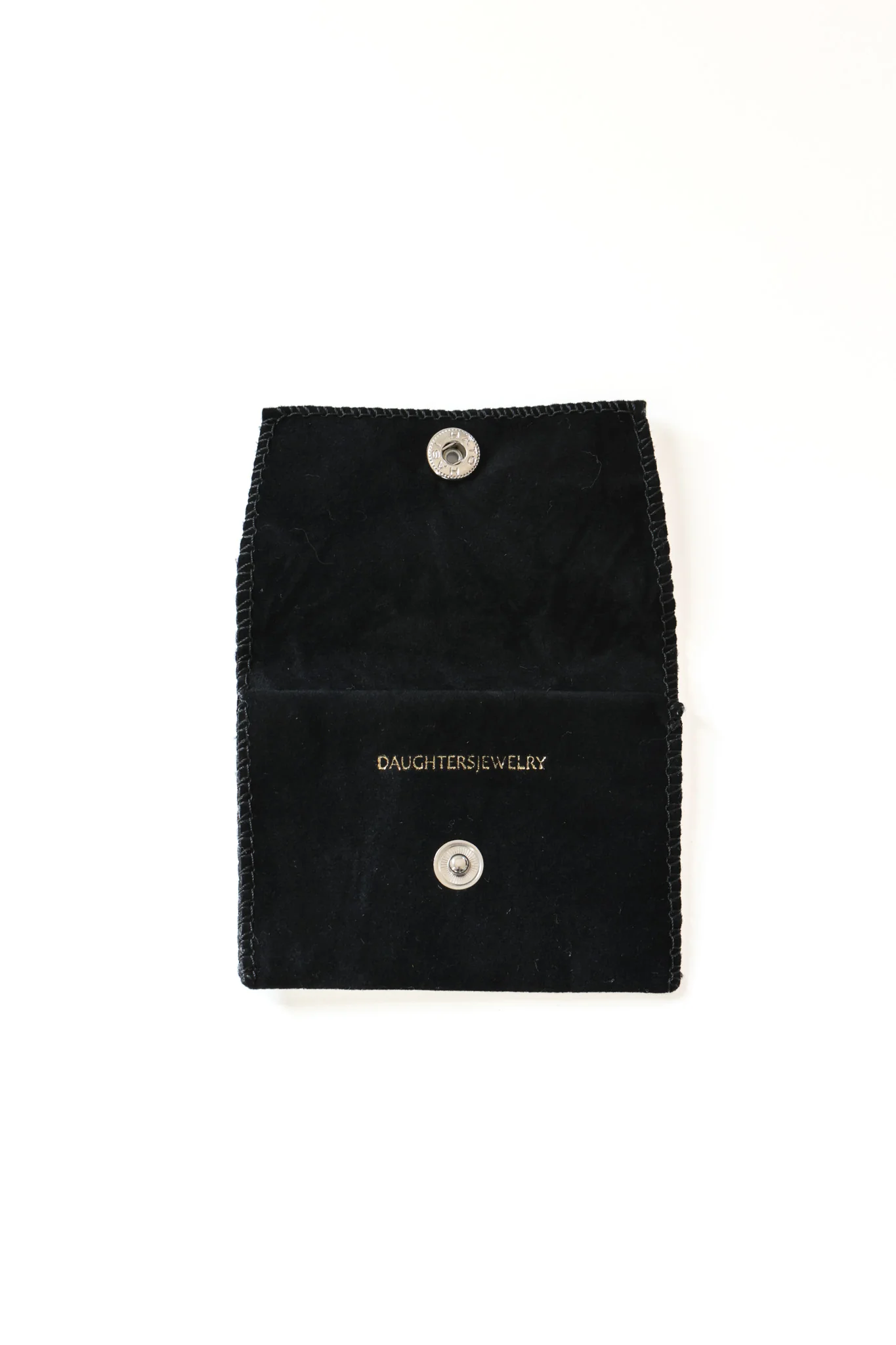 クラシックなブラックのベロア素材を使用した、手のひらサイズのジュエリーポーチ。繊細なリングやピアス、チェーン類の持ち運びに最適なコンパクトサイズで、デイリーにもギフトにも。
